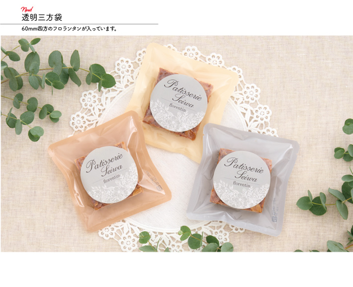 表面が透明、裏面がカラー(グレー、ブラウン、ベージュ)の個包装袋とラベルでお洒落な洋菓子のプチギフト。中には6cm四方のフロランタンが入っています。