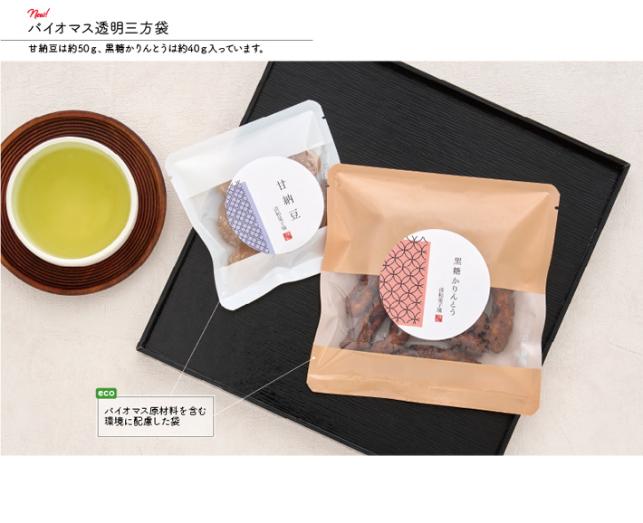 窓付の三方袋に、かりんとうや甘納豆など和菓子を詰めたパッケージです。