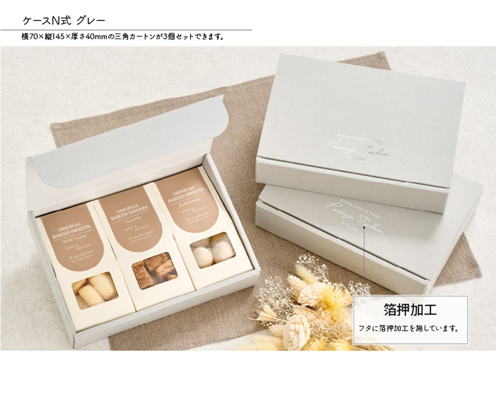 窓付の三角カートンから中身が見える焼菓子ギフトパッケージです。おしゃれなグレーカラーの箱には当社の後加工サービス「箔押加工」を施しています。