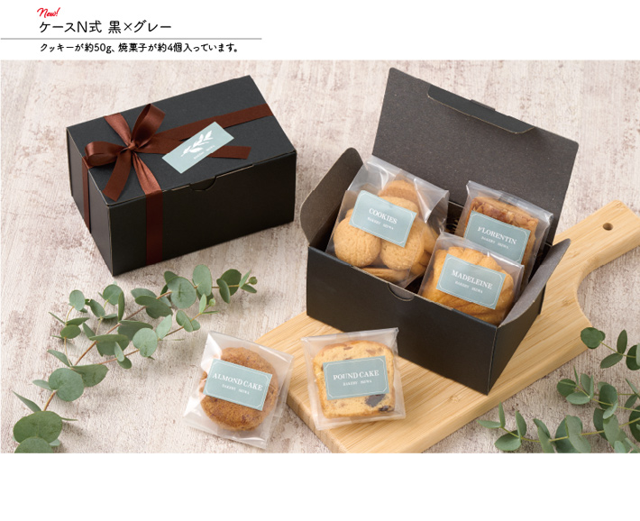 フタと底が一体になった、表面が黒、中面がグレーのギフトボックスです。クッキーなど焼き菓子のお詰合せのパッケージにいかがでしょうか。No.50454には約50gのクッキーが入ります。