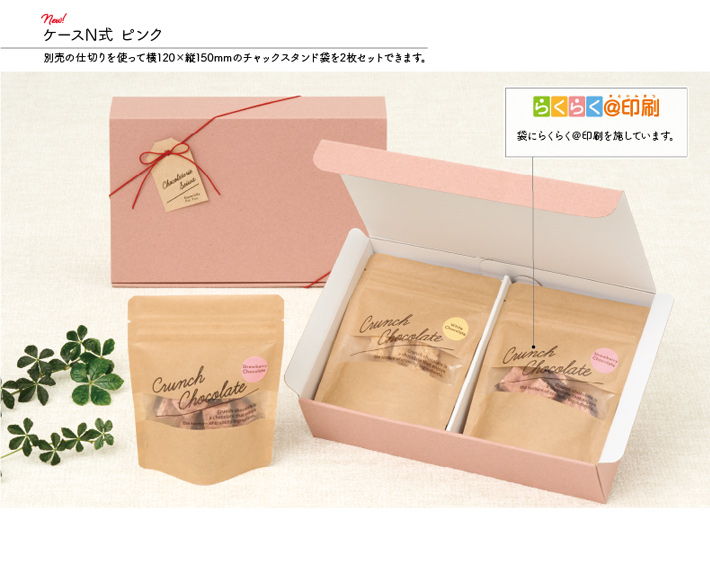 くすみピンクのギフト箱がおしゃれなパッケージです。クランチチョコを入れたチャック付袋には、らくらく@印刷で、オリジナルのデザインを印刷しています。チャック付袋にクランチチョコは約60g入ります。