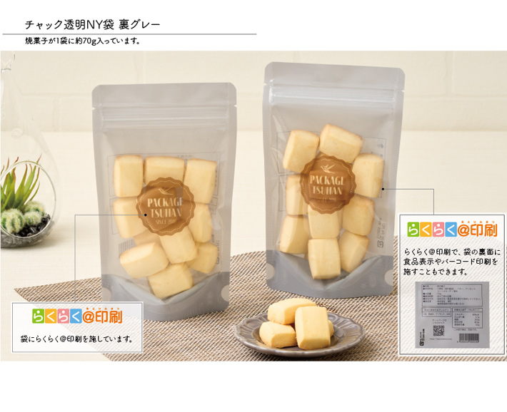ガスバリア性・静防性のある透明フィルムを使用した表が透明、裏がグレーの袋です。前面にショップロゴ、裏面に食品表示など、らくらく@印刷(樹脂凸版による簡易的な印刷)ができます。オリジナルのパッケージ作りにいかがでしょうか。焼き菓子が約70g入ります。