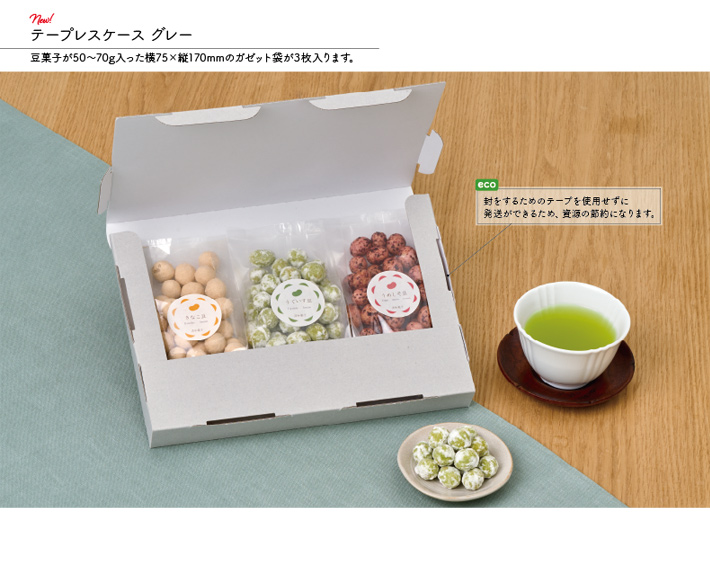 グレーのおしゃれな発送箱に、豆菓子を50〜70gずつ詰め合わせた可愛らしいギフトセットです。発送箱は、クロネコゆうパケット、日本郵便ゆうメール、クリックポスト、日本郵便ゆうパケット対応なので気軽に発送することができます。